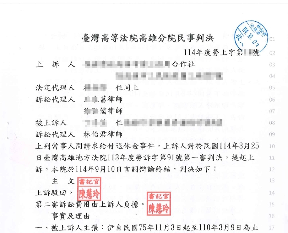 法院判決信合社必須依據優於《勞基法》的內部標準,支付陳小姐退休金。