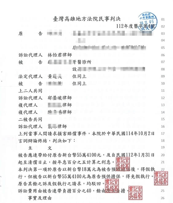 法院最終判決 醫師與診所須連帶賠償 55萬4100元 (矯正費 + 精神賠償)。